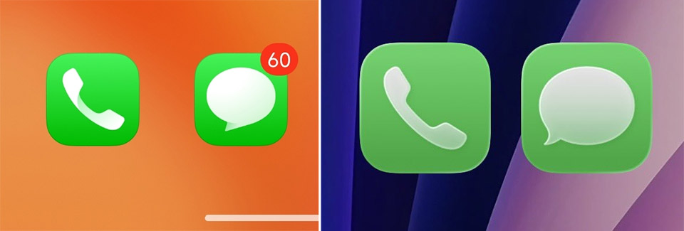 Cả biểu tượng ứng dụng Gọi điện và Tin nhắn đều được chuyển sang hình dạng bo tròn với màu sắc đồng nhất, phản ánh triết lý thiết kế tối giản của Apple.