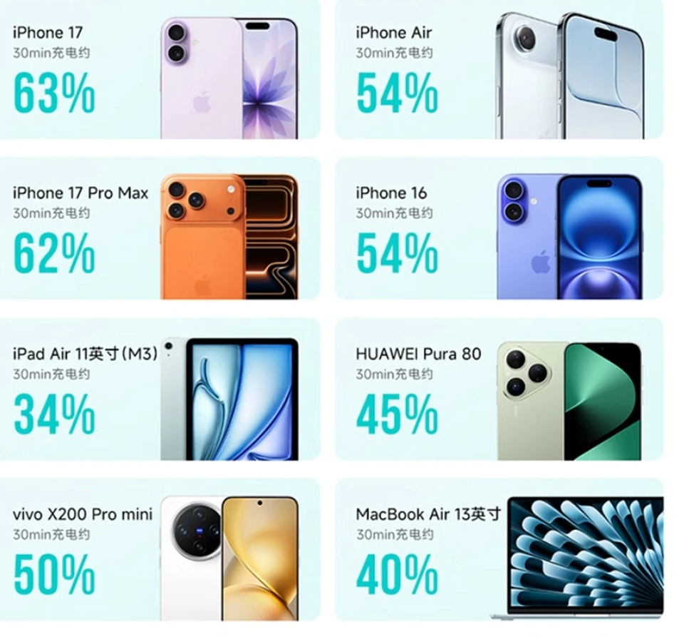 Củ sạc này hỗ trợ nhiều chuẩn sạc nhanh: 30 phút sạc được 63% pin iPhone 17, 62% pin iPhone 17 Pro Max và 40% pin Macbook Air 13.