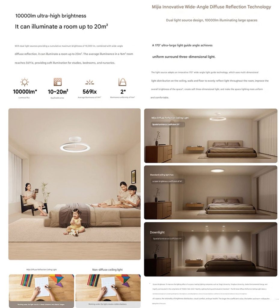 Đèn trần phản xạ khuếch tán Mijia đạt công suất tối đa 10.000 lumen, cho phép chiếu sáng hiệu quả cho các phòng rộng tới 20 m². Trong các thử nghiệm do Xiaomi thực hiện, một căn phòng 16 m² đạt độ rọi trung bình 569 lux, định vị sản phẩm là giải pháp lý tưởng cho phòng ngủ, phòng học, phòng trẻ em và căn hộ nhỏ gọn. Chiều cao 20 cm của đèn góp phần tạo nên không gian phòng cao hơn và rộng rãi hơn về mặt thị giác.