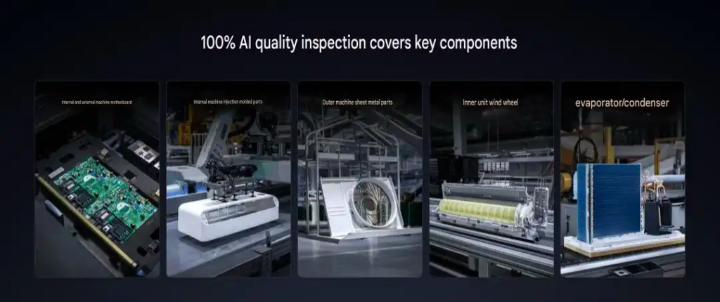 Hơn nữa, nhà máy đã đạt được 100% kiểm tra chất lượng hình ảnh bằng AI đối với các linh kiện chính. Sản xuất truyền thống thường chỉ thực hiện kiểm tra toàn bộ máy móc, trong khi kiểm tra mẫu được sử dụng cho các bộ phận. Nhà máy sản xuất thiết bị gia dụng thông minh của Xiaomi đã đạt được 100% kiểm tra độ chính xác cao đối với các linh kiện chính như bo mạch chủ, các bộ phận đúc phun, các bộ phận kim loại tấm, cánh quạt, dàn bay hơi và dàn ngưng tụ trong các thiết bị trong nhà và ngoài trời thông qua công nghệ kiểm tra chất lượng hình ảnh bằng AI. Quét bằng camera độ phân giải cao kết hợp với các mô hình AI tại chỗ giúp việc kiểm tra vừa nhanh vừa chính xác.