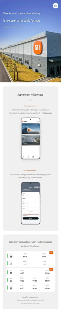 Tối ngày 18/3, ông Shan Lianyu, Tổng Giám đốc Bộ phận Thiết bị Gia dụng Lớn của tập đoàn Xiaomi, đã thông báo trên Weibo rằng Nhà máy sản xuất thiết bị gia dụng thông minh Xiaomi tại Vũ Hán chính thức mở cửa cho công chúng tham quan. Việc đăng ký tham quan trong tháng 3 và tháng 4 đã bắt đầu. Để đảm bảo chất lượng tham quan, mỗi phiên chỉ giới hạn 20 nhóm người hâm mộ Xiaomi.