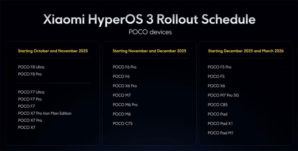 Hôm 27/11/2025, POCO đã ra mắt hai mẫu điện thoại thông minh POCO F8 Pro và POCO F8 Ultra trên toàn cầu, cùng với POCO Pad M1 và POCO Pad X1. Tuy nhiên, trong sự kiện ra mắt, POCO cũng đã tiết lộ lịch trình triển khai HyperOS 3 cho các điện thoại thông minh của mình. Xiaomi đã bắt đầu triển khai HyperOS 3 dựa trên hệ điều hành Android 16 thế hệ tiếp theo trên thị trường toàn cầu, mang đến nhiều tính năng và thay đổi mới.