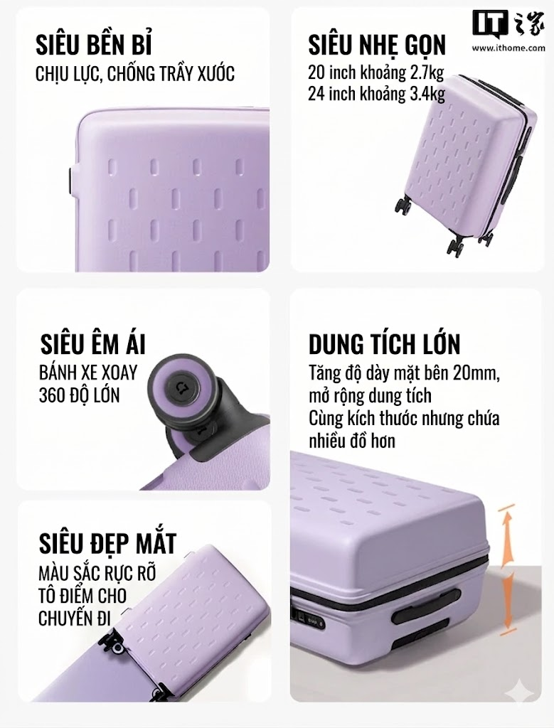 Xiaomi vừa bổ sung thêm tùy chọn màu tím mới cho dòng sản phẩm “vali Mijia Colorful” trên trang gọi vốn Youpin (bấm vào đây để xem). Phiên bản 20 inch có giá 199 nhân dân tệ (760.000 đồng), và phiên bản 24 inch có giá 299 nhân dân tệ (1,14 triệu đồng).