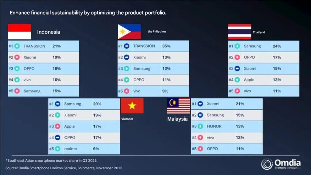 Samsung dẫn đầu khu vực với 4,6 triệu chiếc được bán ra và chiếm 18% thị phần, nhờ vào việc mở rộng sang các thị trường cao cấp hơn như Thái Lan, Việt Nam và Malaysia. Chiến lược này đã bù đắp hiệu quả cho sự tăng trưởng của các đối thủ cạnh tranh tại các thị trường nhạy cảm hơn về giá như Indonesia và Philippines.