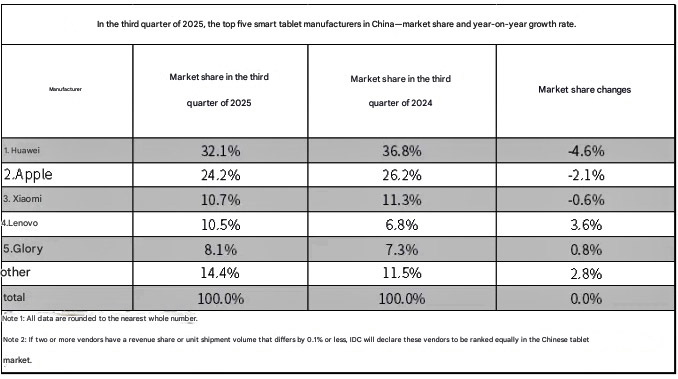 Top 5 nhà cung cấp tablet hàng đầu trong quý 3/2025 ở thị trường Trung Quốc: