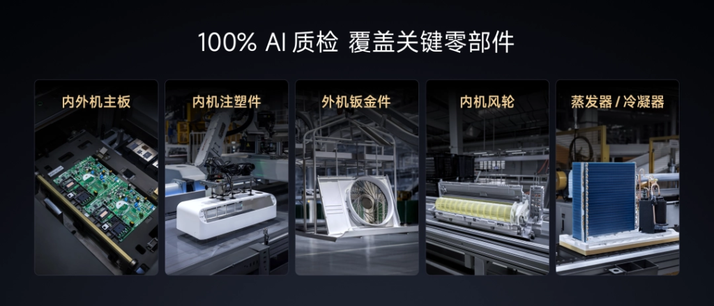 Hơn nữa, nhà máy đã đạt được 100% kiểm tra chất lượng hình ảnh bằng AI đối với các linh kiện chính. Sản xuất truyền thống thường chỉ thực hiện kiểm tra toàn bộ máy móc, trong khi kiểm tra lấy mẫu được sử dụng cho các bộ phận. Nhà máy sản xuất thiết bị gia dụng thông minh của Xiaomi đã đạt được 100% kiểm tra độ chính xác cao đối với các linh kiện chính như bo mạch chủ, các bộ phận đúc phun, các bộ phận kim loại tấm, cánh quạt, dàn bay hơi và dàn ngưng tụ trong các thiết bị trong nhà và ngoài trời thông qua công nghệ kiểm tra chất lượng hình ảnh bằng AI tiên tiến. Công nghệ quét bằng camera độ phân giải cao kết hợp với mô hình AI tại chỗ giúp việc kiểm tra vừa nhanh chóng vừa chính xác.
