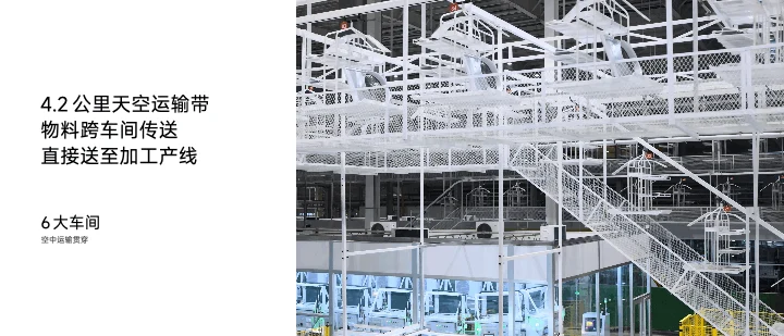 Là một nhà máy thông minh thế hệ mới, nhà máy này đã đạt được mức độ tự động hóa cao. Các xưởng ép phun và gia công kim loại tấm đã đạt được sản xuất tự động hoàn toàn “không cần giám sát”, với một số bộ phận có dung sai chính xác đến ±0,05 milimét. Hệ thống băng tải trên không dài 4,2 km, giống như “mạch máu” của nhà máy, kết nối hiệu quả sáu xưởng sản xuất, cho phép vận chuyển vật liệu thông minh giữa các khu vực.