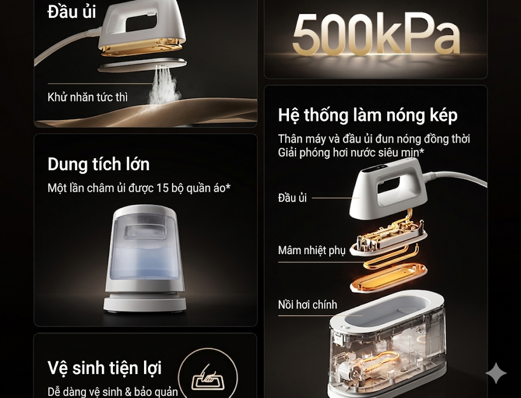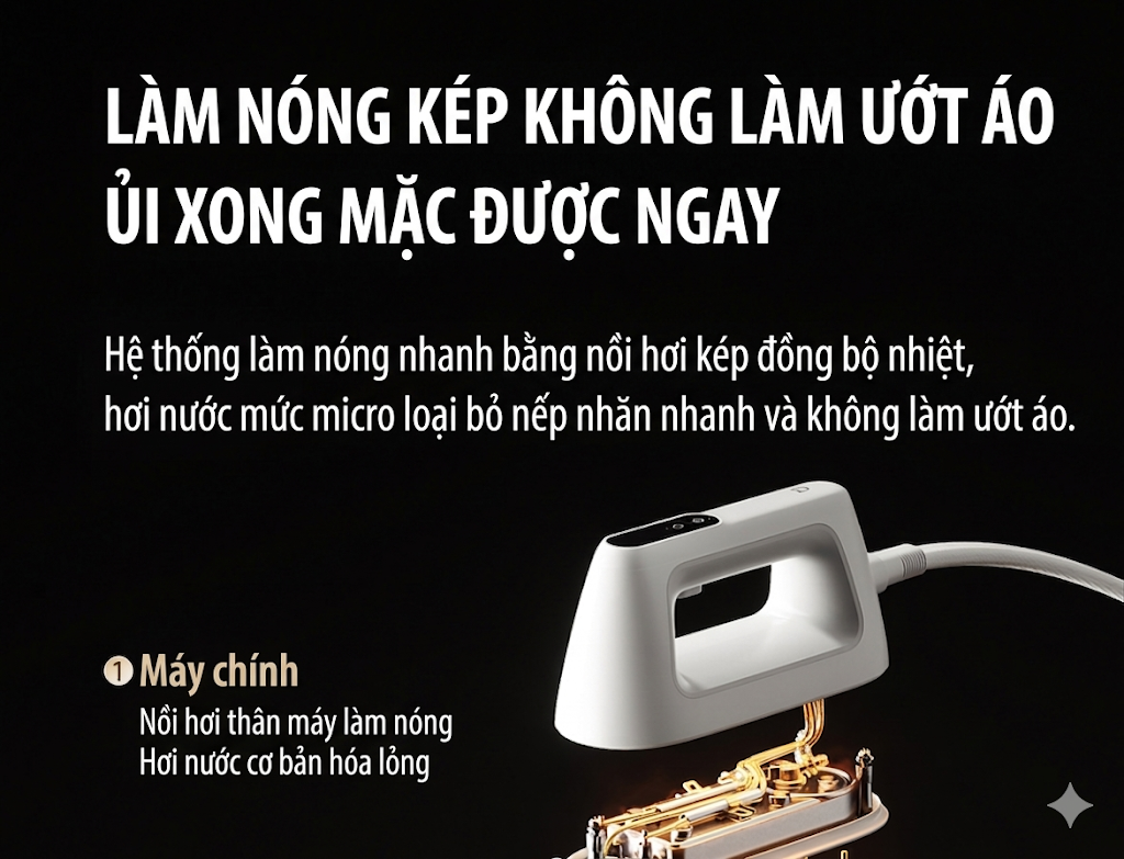 Bàn là sử dụng hệ thống gia nhiệt kép với nồi hơi riêng biệt cho thân máy và bàn ủi, tạo ra hơi nước khô giúp ngăn quần áo bị ẩm. Tốc độ làm nóng chỉ trong 65 giây, giảm thời gian chờ đợi.