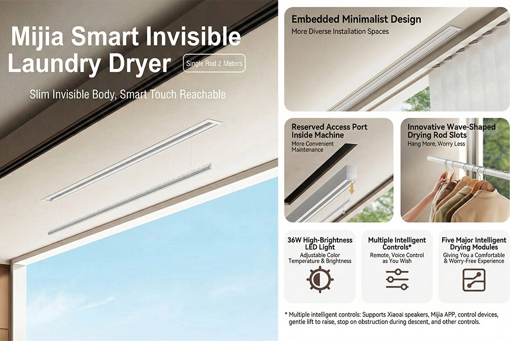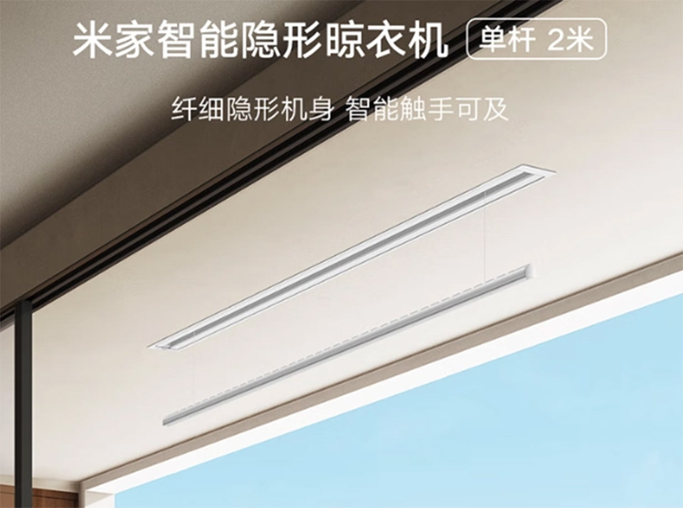 Giá phơi quần áo thông minh Mijia của Xiaomi được chế tạo theo phong cách tối giản và linh hoạt, phù hợp với nội thất căn hộ hiện đại. Điều này có thể thực hiện được nhờ hệ thống lắp đặt âm trần, cho phép toàn bộ thiết bị được giấu kín khi không sử dụng.