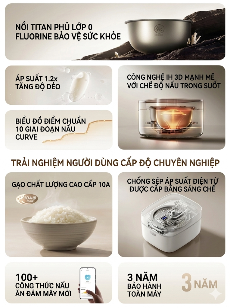 Quá trình này cho phép hạt gạo hấp thụ nước hiệu quả hơn, cho ra hạt gạo mềm hơn, đàn hồi hơn với độ ngọt và độ dẻo tốt hơn. Xiaomi đã trang bị cho nồi cơm điện đường cong nấu thông minh 10 cấp tự động điều chỉnh nhiệt độ, thời gian nấu và áp suất dựa trên loại gạo và lượng nước.