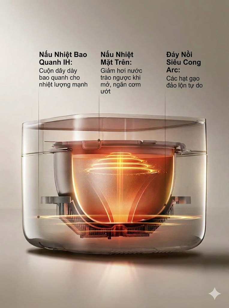 | Công nghệ IH (viết tắt từ Induction Heating – công nghệ đốt nóng trong) hay còn gọi là gia nhiệt cảm ứng. Đây là là quá trình làm nóng không tiếp xúc. Thay vì tác động gia nhiệt từ nguồn nhiệt bên ngoài, công nghệ IH sẽ thông qua cảm ứng làm sinh ra nhiệt ngay từ bên trong vật liệu có dẫn điện. Hiểu theo cách đơn giản thì nồi cơm điện sử dụng công nghệ IH sẽ không làm nóng lòng nồi trực tiếp thông qua mâm nhiệt mà sử dụng điện cao tần để làm nóng lòng nồi (tương tự như cơ chế hoạt động của bếp từ). Vì vậy nên quá trình gia nhiệt sẽ được rút ngắn, ít thoát nhiệt và không chịu ảnh hưởng từ yếu tố bên ngoài. |