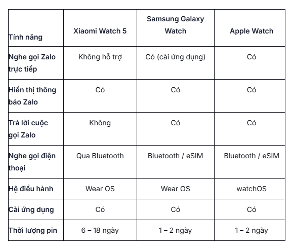 Trong khi Galaxy Watch và Apple Watch cho phép cài ứng dụng Zalo và nghe gọi trực tiếp (đặc biệt bản có eSIM), Xiaomi Watch 5 vẫn phụ thuộc vào điện thoại cho cuộc gọi Zalo. Tuy nhiên, ở mức giá khoảng 9 triệu, Xiaomi lại vượt trội về pin và giá trị sử dụng hàng ngày nếu bạn không coi gọi Zalo là tính năng bắt buộc.